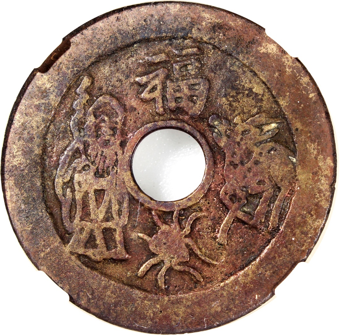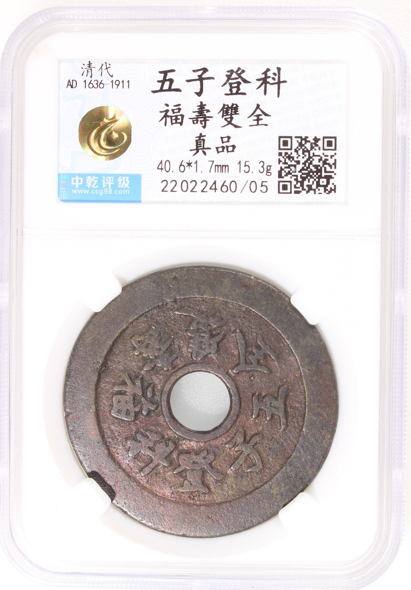 蘇爐福壽雙全五子登科圓穿花錢,背福鹿壽蟢,清朝(公元1644–1911),40.6*1.7mm,重15.3g,中乾真品。
