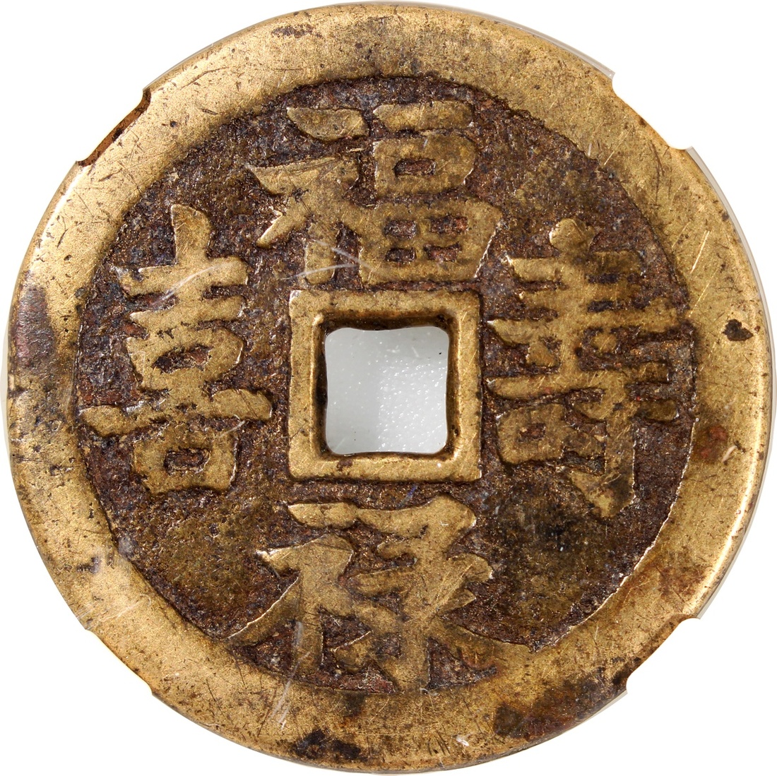China: Qing Dynasty (1644-1911 CE), coin-shaped charm with square central hole, Zhejiang mint production, obverse inscribed with 'Fu lu shou xi', reverse showing bat, deer, crane and magpie, 40*2.7mm, 24.8g, Zhong Qian 80. Rare.