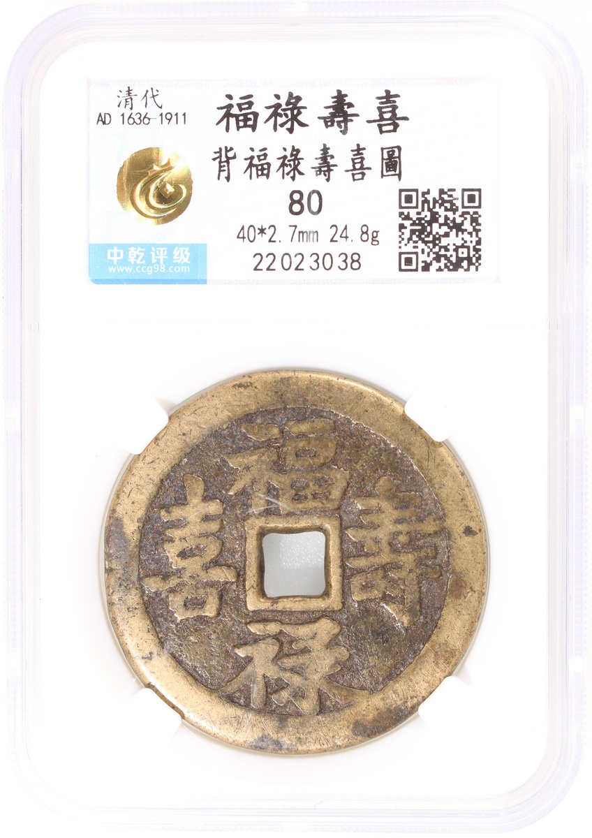 浙爐福祿壽喜方穿花錢,背福祿壽喜圖,清朝(公元1644–1911),40*2.7mm,重24.8g,中乾80。少見。