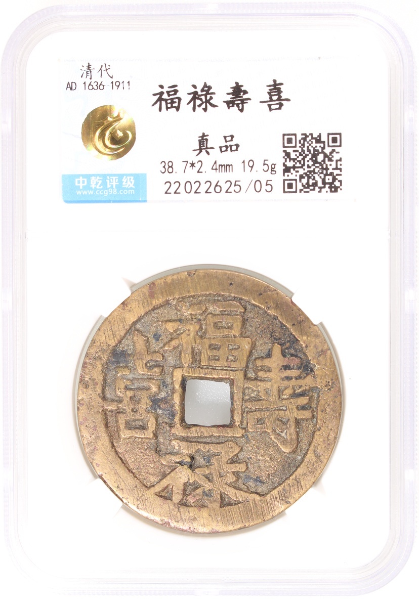 浙爐福祿壽喜方孔花錢,背蝠鹿鶴鵲,清朝(公元1644–1911),38.7*2.4mm,重19.5g,中乾真品。少見。