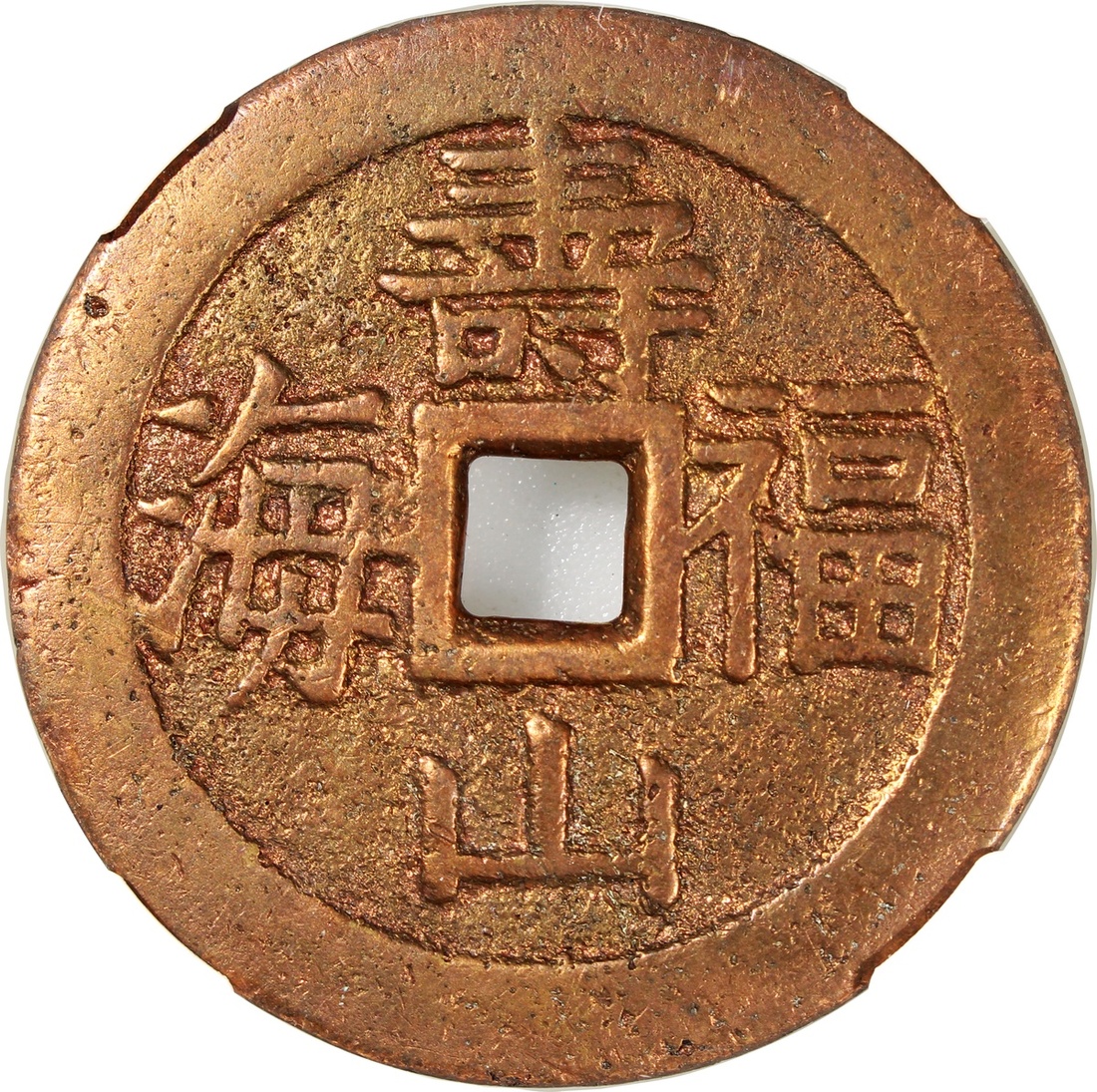 China: Qing Dynasty (1644-1911 CE), coin-shaped charm with square central hole, Guizhou mint production, obverse inscribed with 'Shou shan fu hai', reverse showing dragon and phoenix, 51.4*2.9mm, 41.8g, Zhong Qian 82. Extremely fine.
