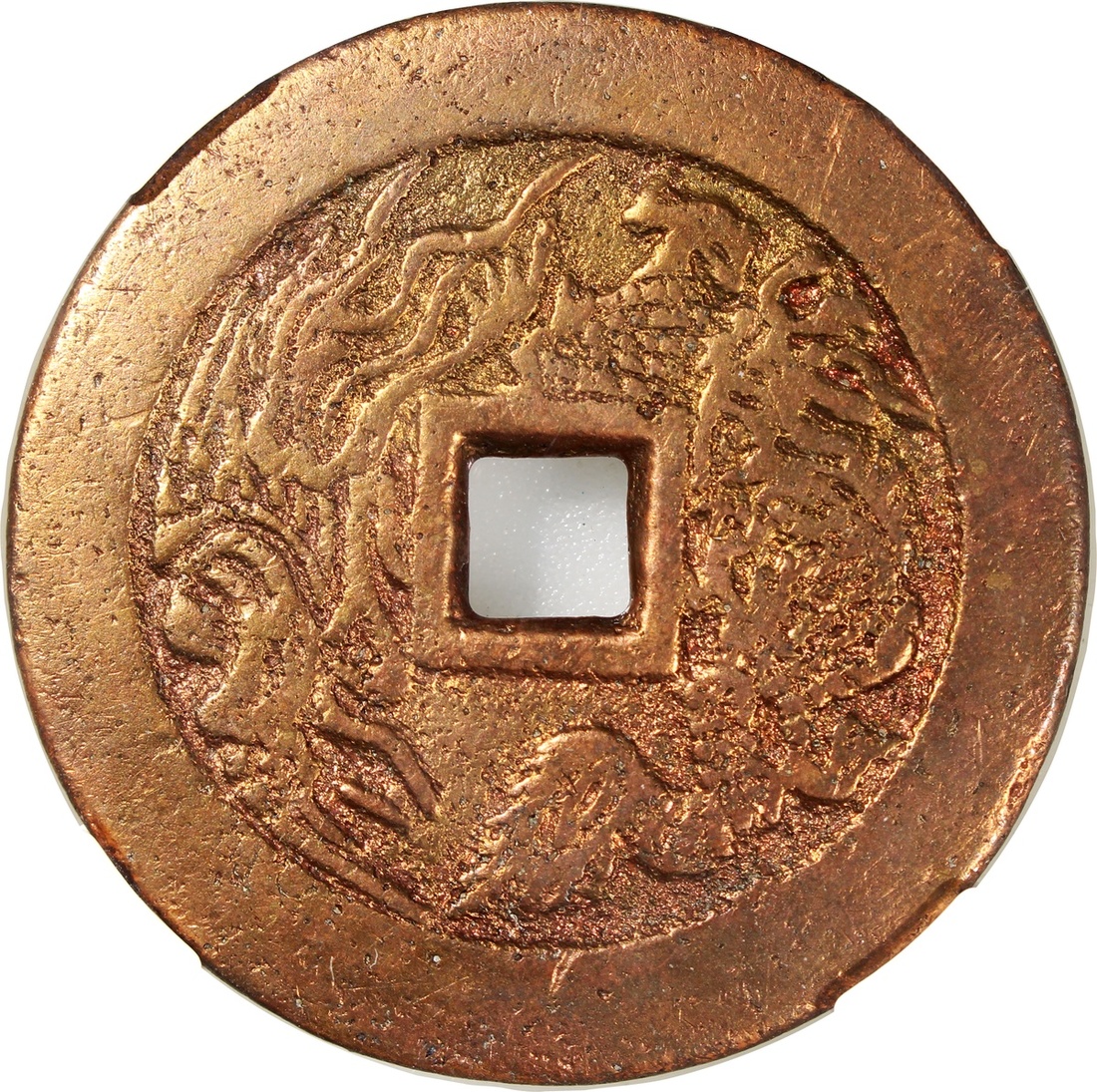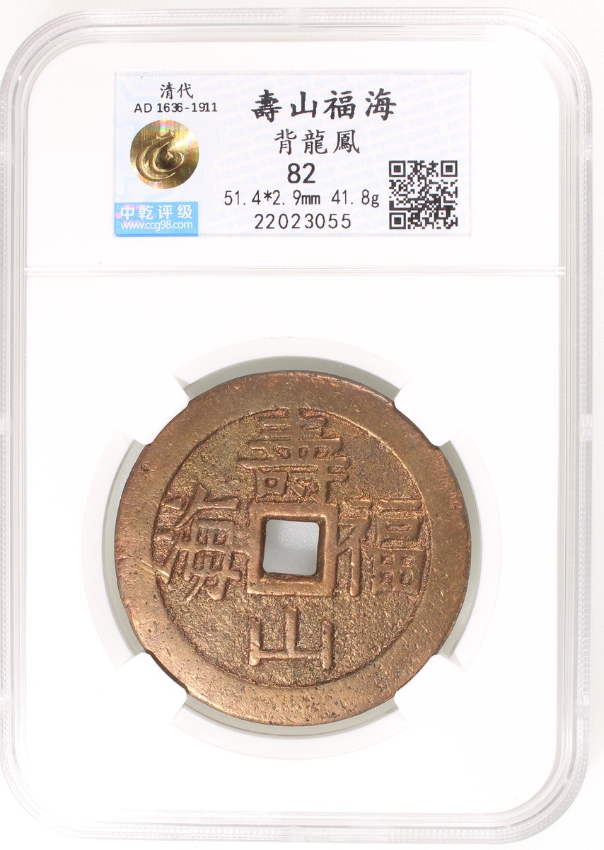 貴爐壽山福海方穿花錢,背龍鳳,清朝(公元1644–1911),51.4*2.9mm,重41.8g,中乾82。品相極美,好版。