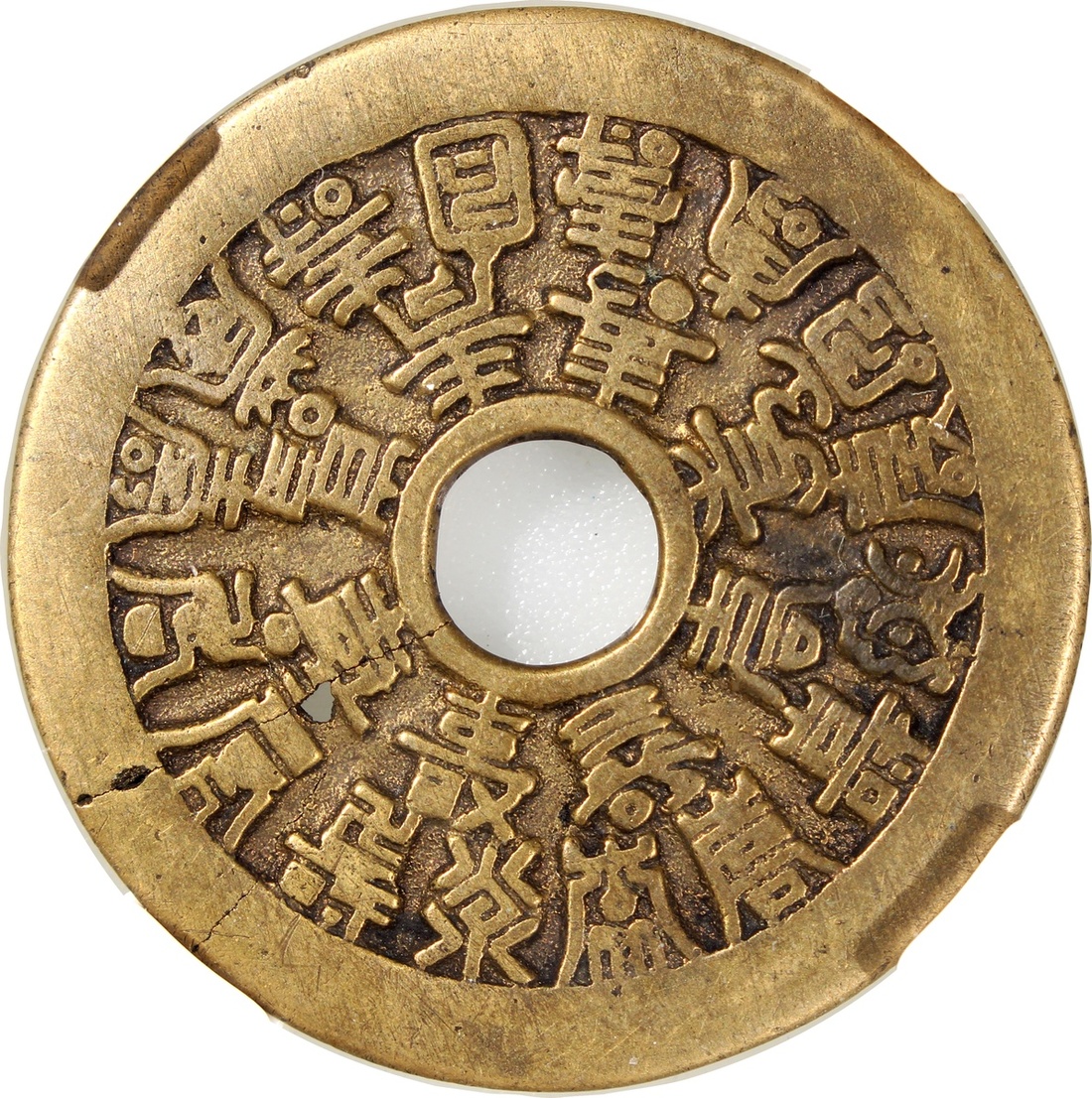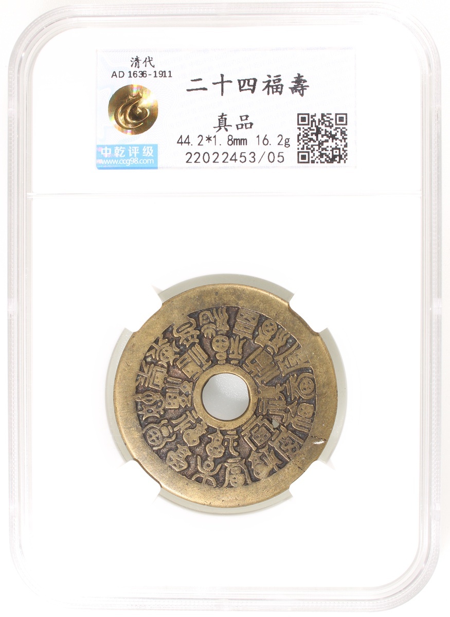 二十四福壽圓穿花錢,背吉祥圖案,清朝(公元1644–1911),44.2*1.8mm,重16.2g,中乾真品。