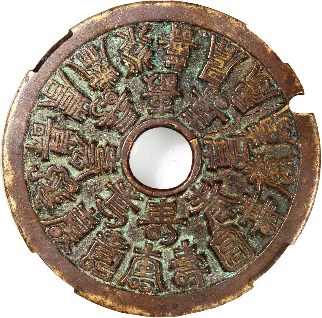 China: Qing Dynasty (1644-1911 CE), coin-shaped charm with round hole, obverse inscribed with 24 characters of 'Fu' in different scripts, reverse inscribed with 24 characters of 'Shou' in different scripts, 48.7*2.1mm, 25.1g, Zhong Qian Genuine.