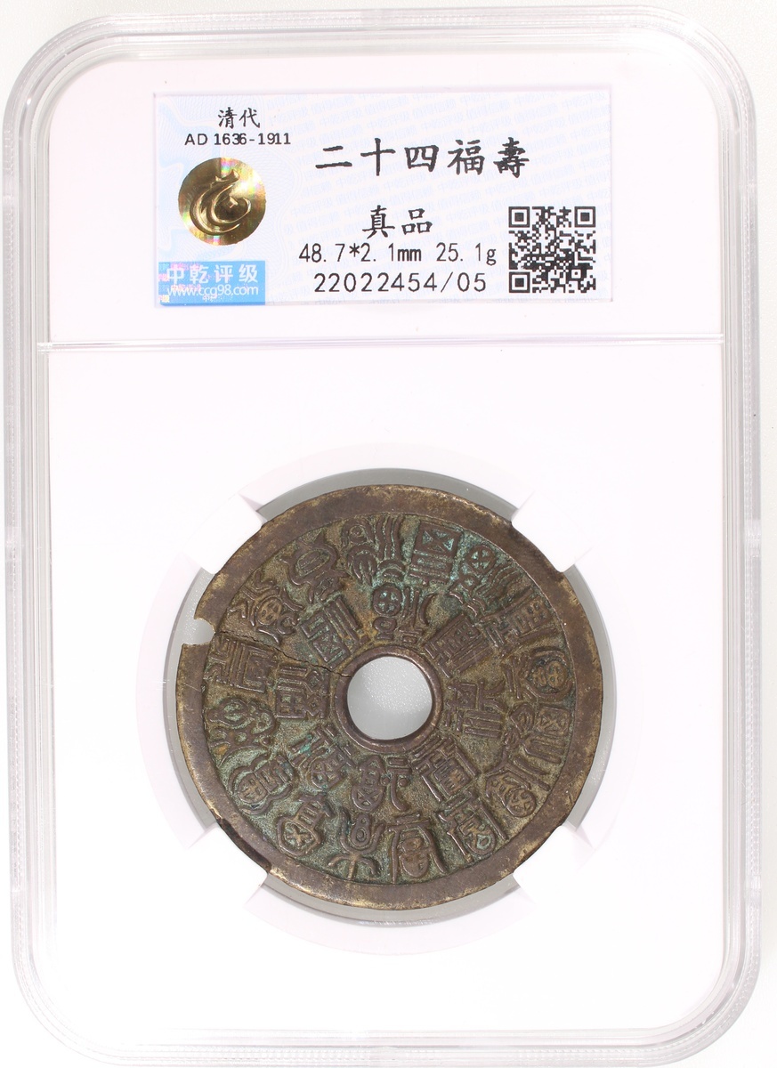 二十四福壽圓穿花錢,背吉祥圖案,清朝(公元1644–1911),48.7*2.1mm,重25.1g,中乾真品。