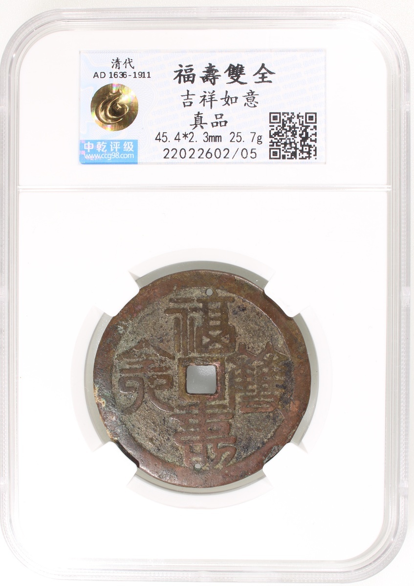 浙爐篆書福壽雙全方孔花錢,背吉祥如意,清朝(公元1644–1911),45.4*2.3mm,重25.7g,中乾真品。少見。