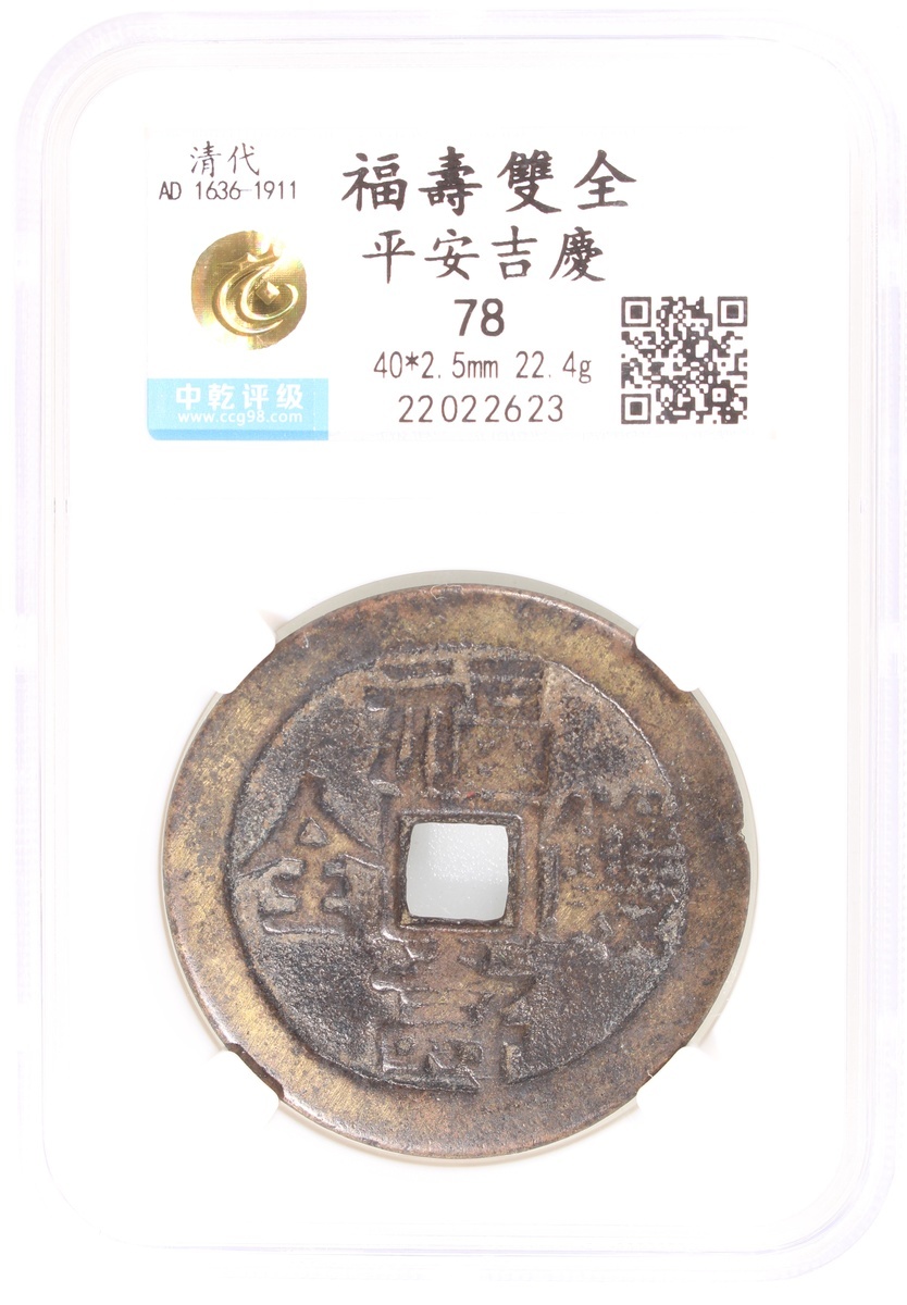 福壽雙全方孔花錢,背平安吉慶,清朝(公元1644–1911),40*2.5mm,重22.4g,中乾78。