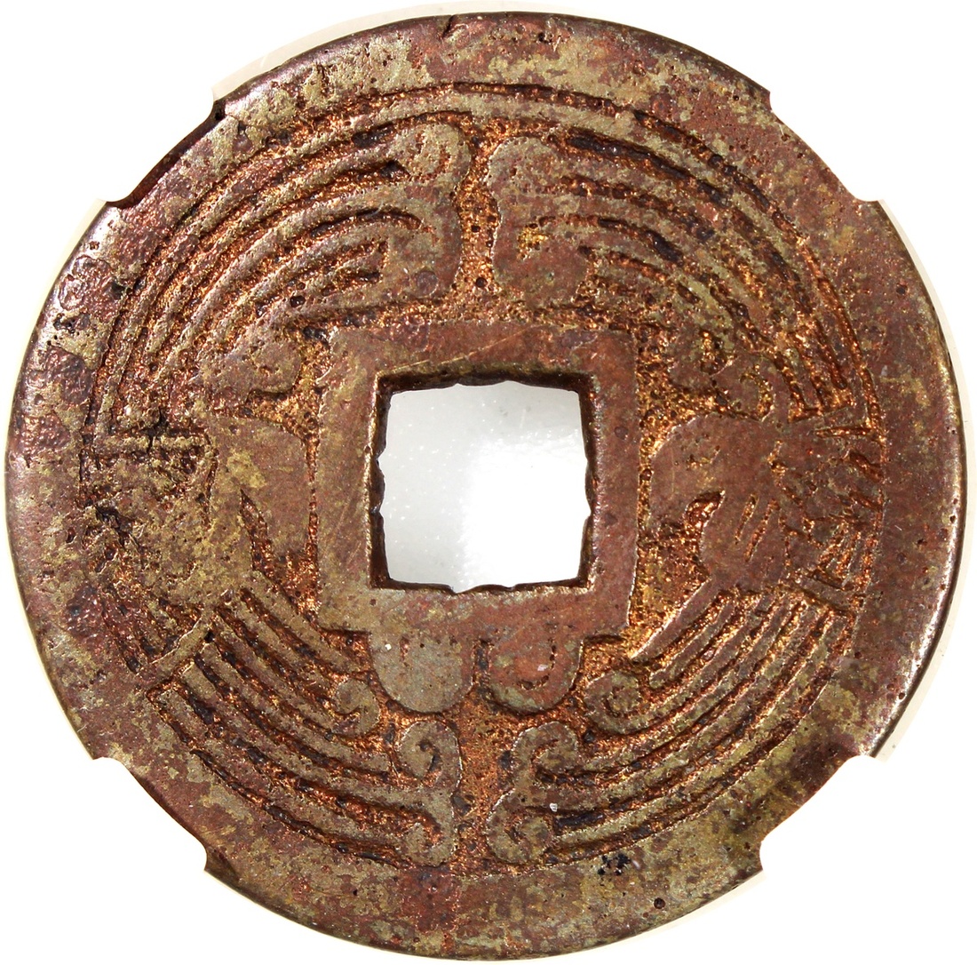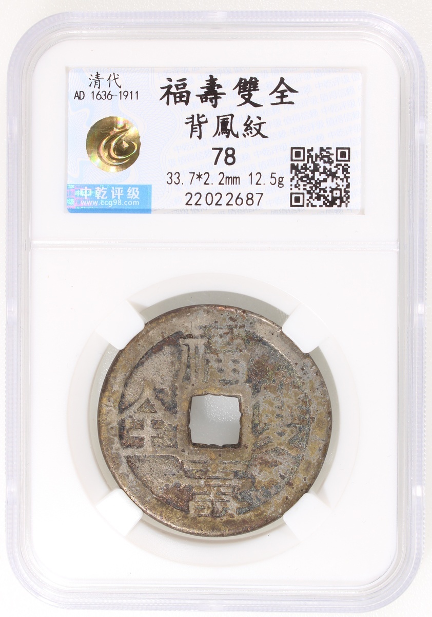 貴爐福壽雙全方穿花錢,背龍鳳,清朝(公元1644–1911),33.7*2.2mm,重12.5g,中乾78。少見。