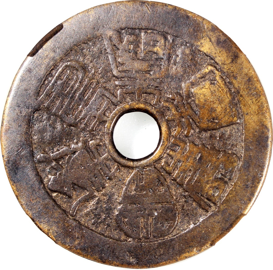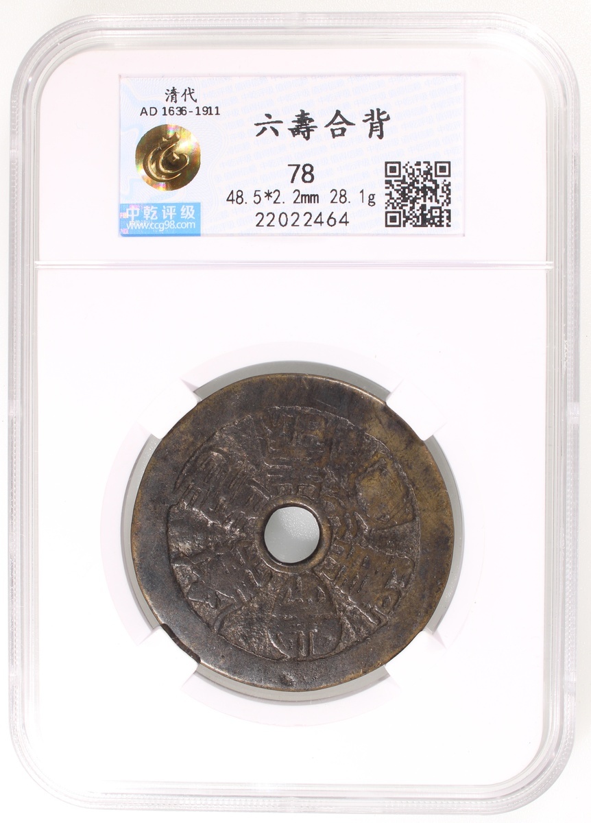 粵爐六壽合背圓孔花錢,清朝(公元1644–1911),48.5*2.2mm,重28.1g,中乾78。極美品,少。