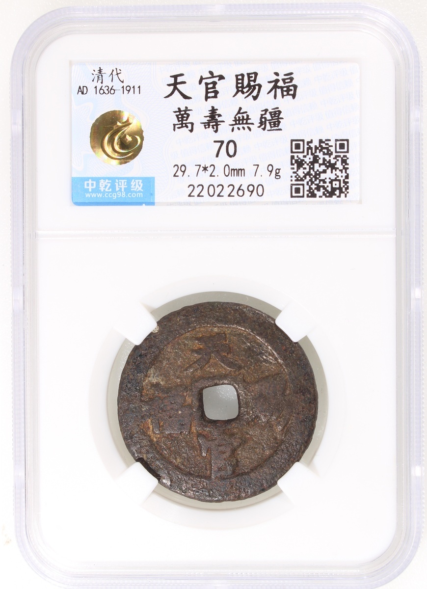 China: Qing Dynasty (1644-1911 CE), coin-shaped charm with square central hole, obverse inscribed 'Tian guan ci fu', reverse inscribed 'Wan shou wu jiang', 29.7*2.0mm, 7.9g, Zhong Qian 70. Rare.