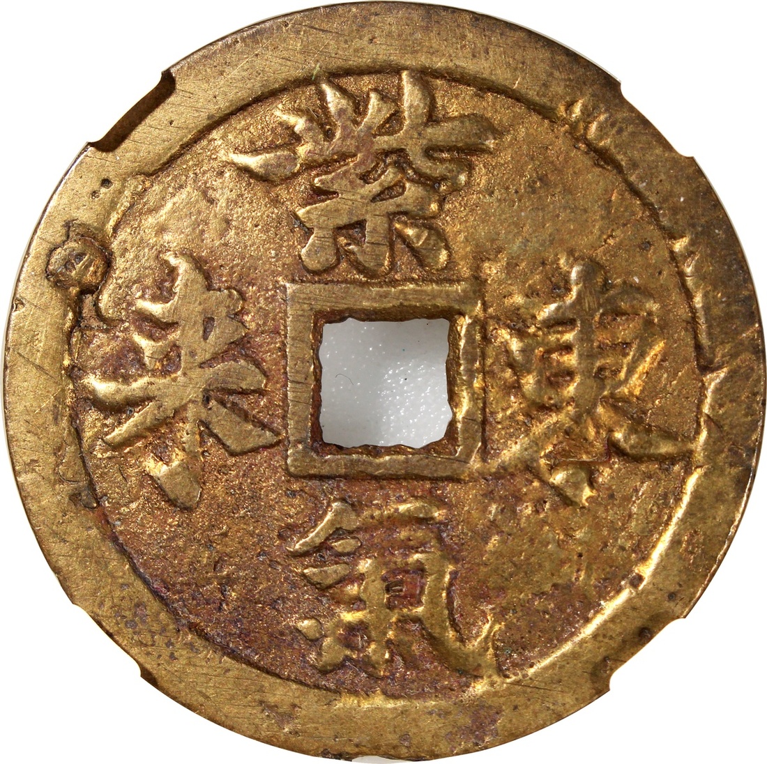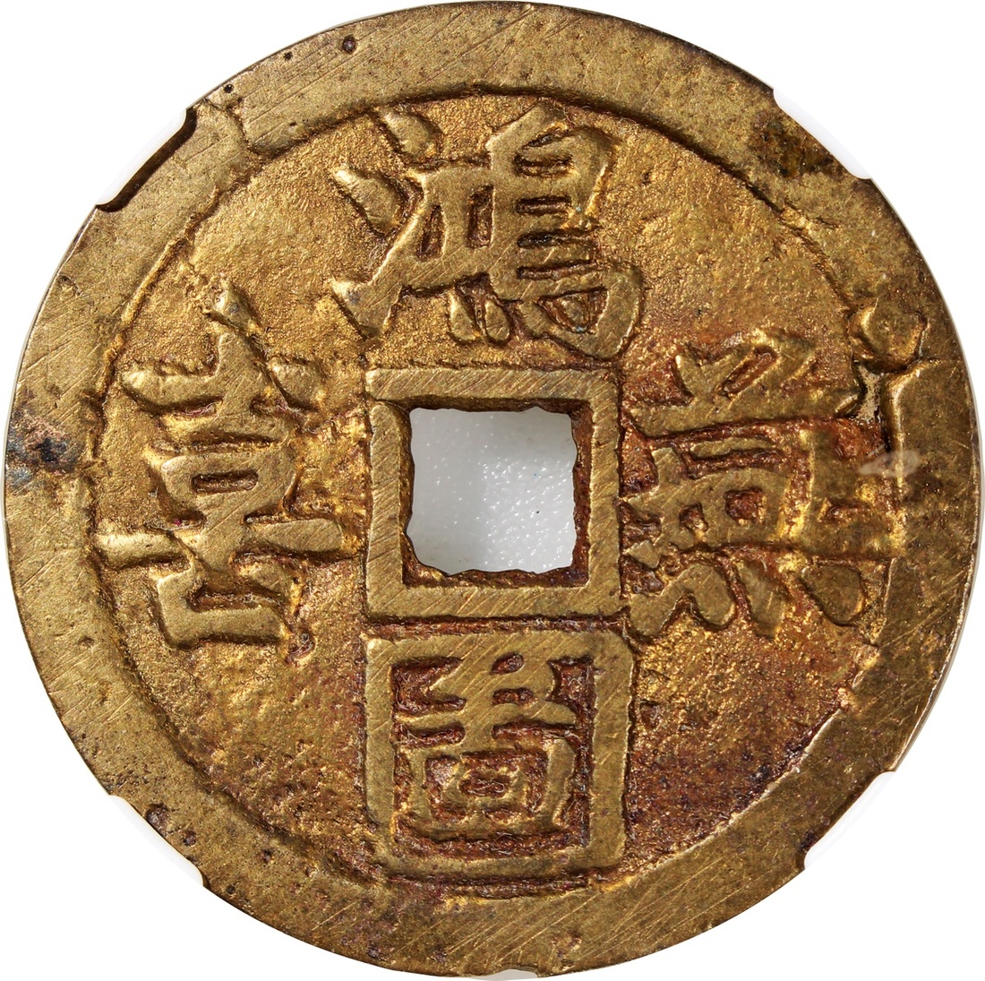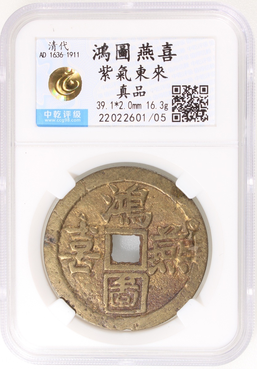 China: Qing Dynasty (1644-1911 CE), coin-shaped charm with square central hole, Zhejiang mint production, obverse inscribed 'Hong tu yan xi', reverse inscribed 'Zi qi dong lai', 39.1*2.0mm, 16.3g, Zhong Qian Genuine. Rare.