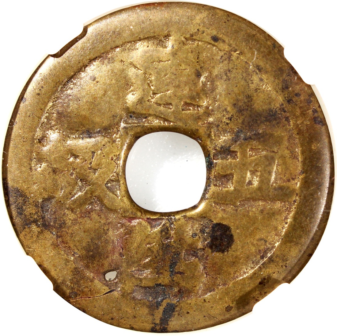 喜報三元方穿花錢,背連昇五級,清朝(公元1644–1911),35.3*1.7mm,重9.9g,中乾真品。