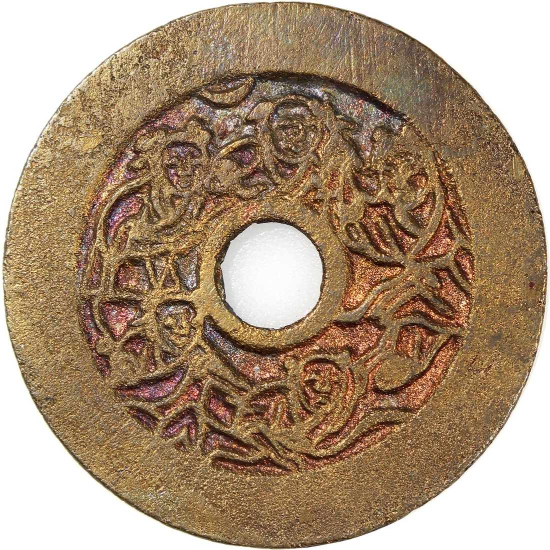 China: Qing Dynasty (1644-1911 CE), coin-shaped charm with round central hole, Jiangsu mint production, obverse inscribed 'Ming deng jin bang wei lie san tai', reverse showing five male children, 45.4x1.6mm, 17.1g. In excellent condition.