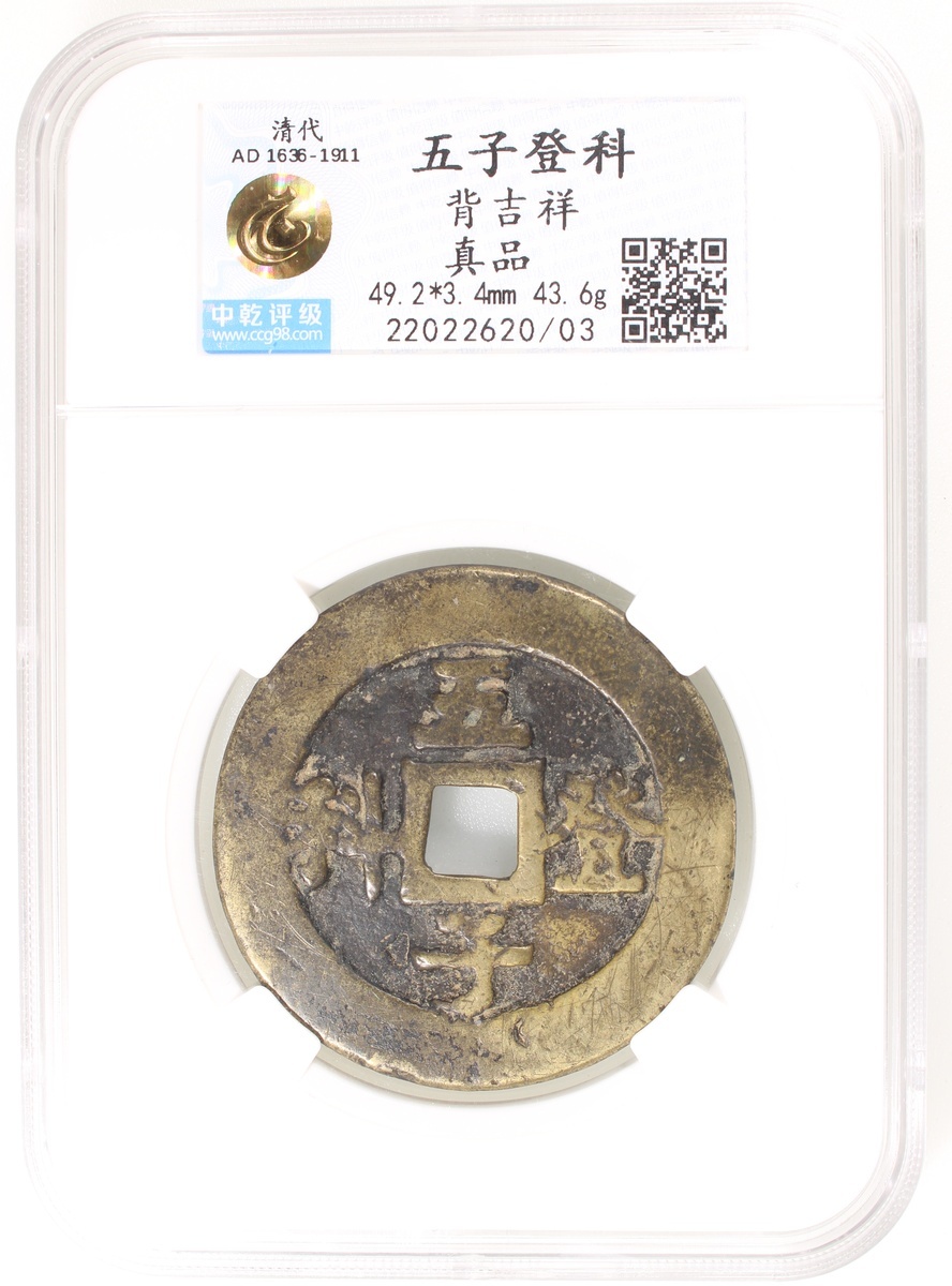 China: Qing Dynasty (1644-1911 CE), coin-shaped charm with square central hole, Peking mint production, obverse inscribed 'Wu zi deng ke', reverse inscribed 'Ji xiang', 49.2*3.4mm, 43.6g, Zhong Qian Genuine. Rare. Note: This piece is stylistically most similar to another type inscribed 'Fu shou shuang quan' on the obverse and 'Kang ning' on the reverse (No 72 in Chinese Charms: Art, Religion, and Folk Belief by Alex C. Fang, The Commercial Press 2008), 'Long feng cheng xiang' charm with 'Fu shou' inscriptions on reverse (Lot 15193, Poly Autumn Sale 2023), and 'Zhi ri gao sheng' with 'Ru yi' inscriptions on reverse (Lot 8417, Guardian Spring Sale 2017), which are believed to have been issued by the imperial palace.