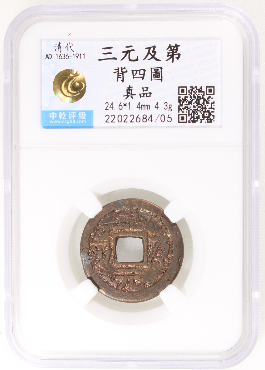 三元及第圓穿花錢,背雜寶,清朝(公元1644–1911),24.6*1.4mm,重4.3g,中乾真品。少見。
