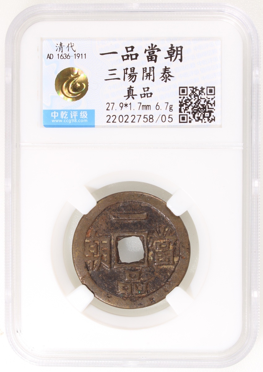 一品當朝方孔花錢,背三陽開泰,清朝(公元1644–1911),27.9*1.7mm,重6.7g,中乾真品。