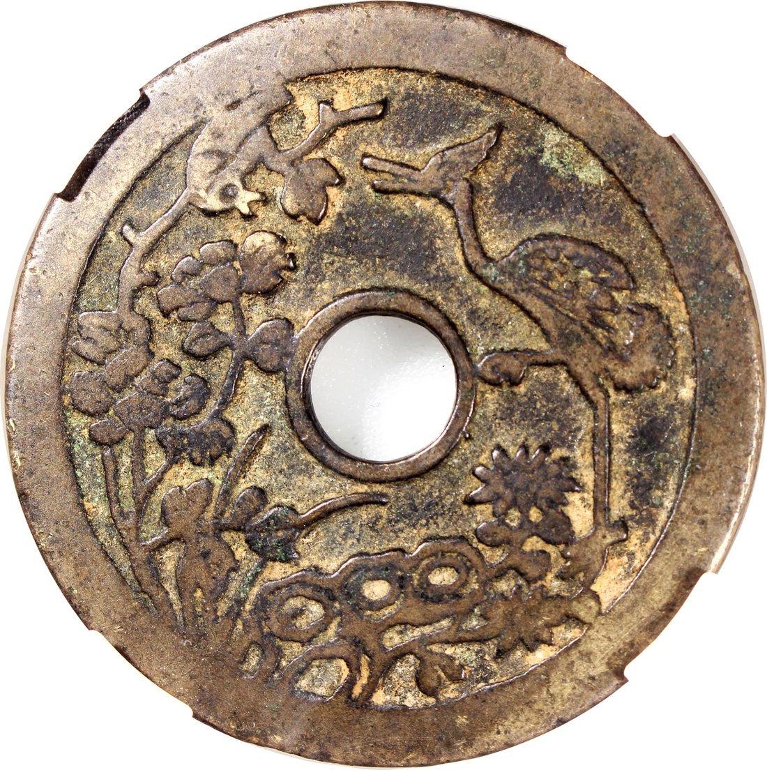 China: Qing Dynasty (1644-1911 CE), coin-shaped charm with round hole, obverse inscribed 'Yi pin dang chao zhuang yuan ji di', reverse showing egret in flowers, 48.7*2.4mm, 27.8g, Zhong Qian 82.