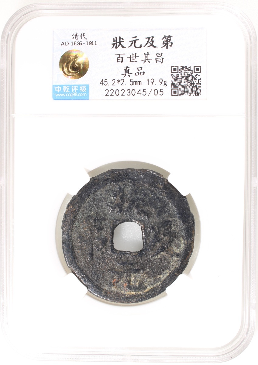 状元及第方穿花錢,背百世其昌,清朝(公元1644–1911),45.2*2.5mm,重19.9g,中乾真品。