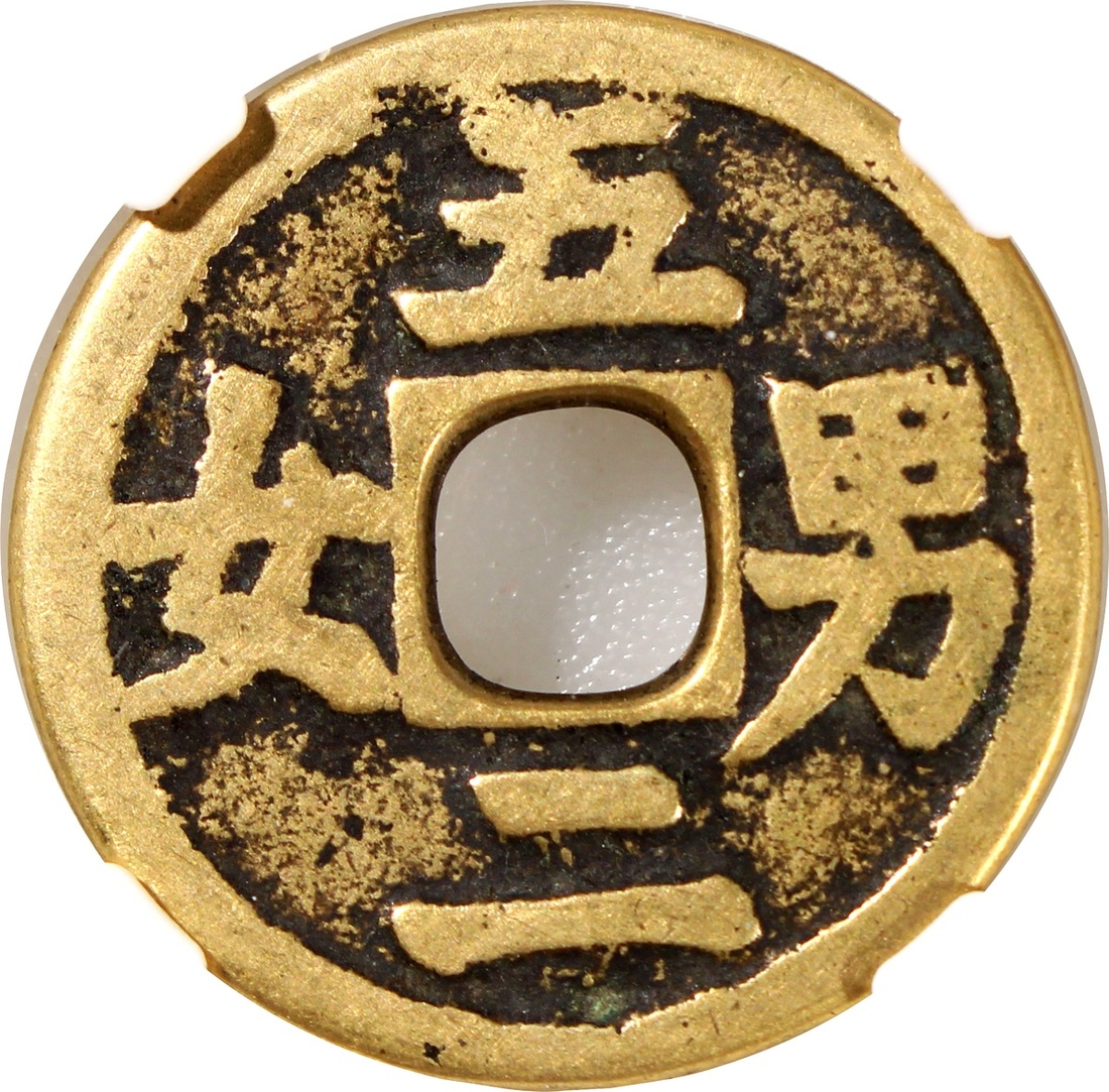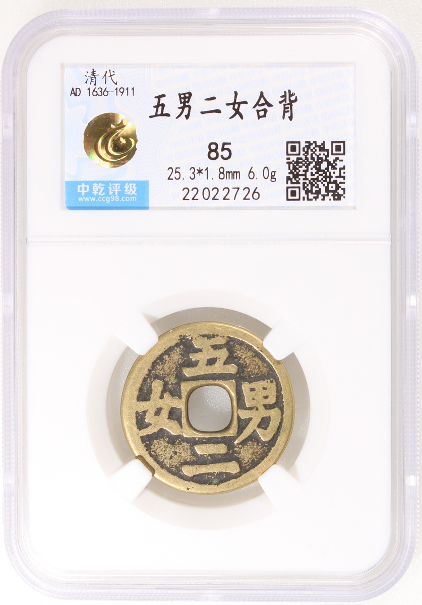五男二女合背方孔花錢,清朝(公元1644–1911),25.3*1.8mm,重6.0g,中乾85。錢體規整,品相極美,少見。