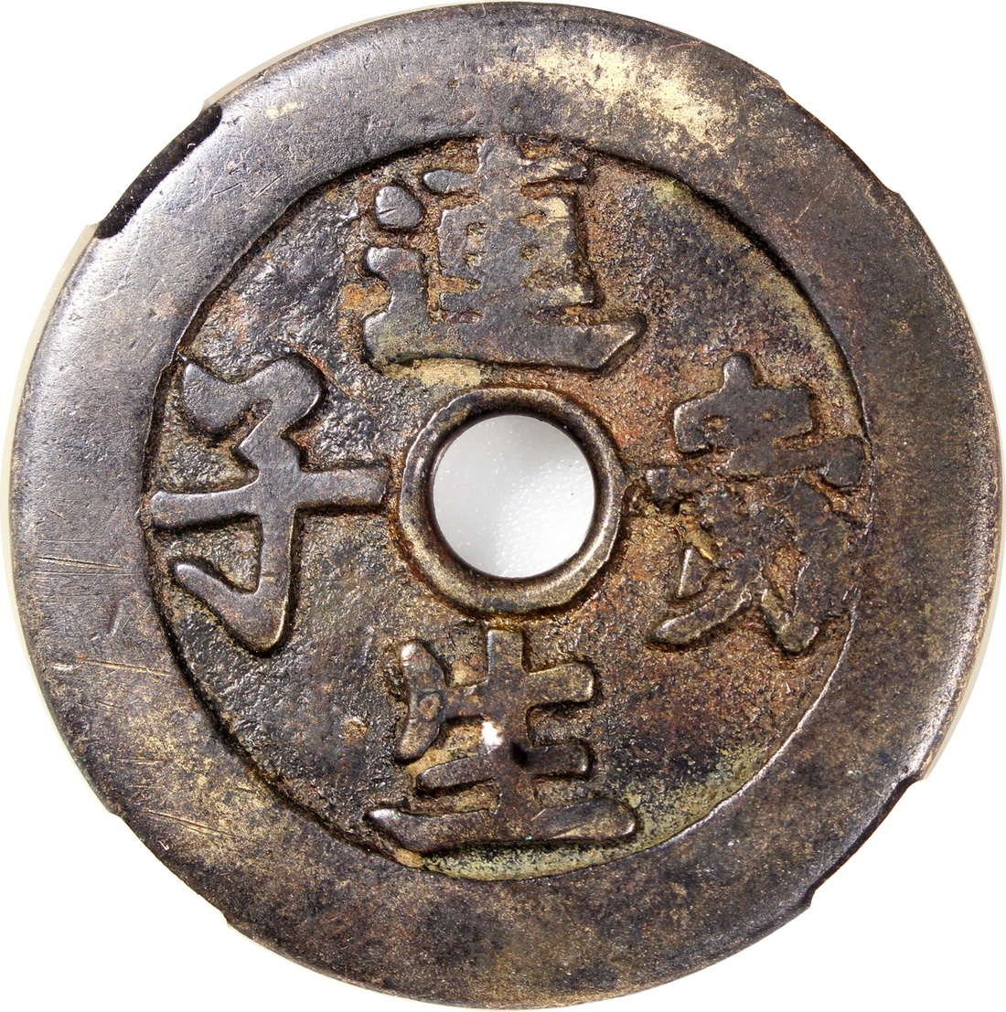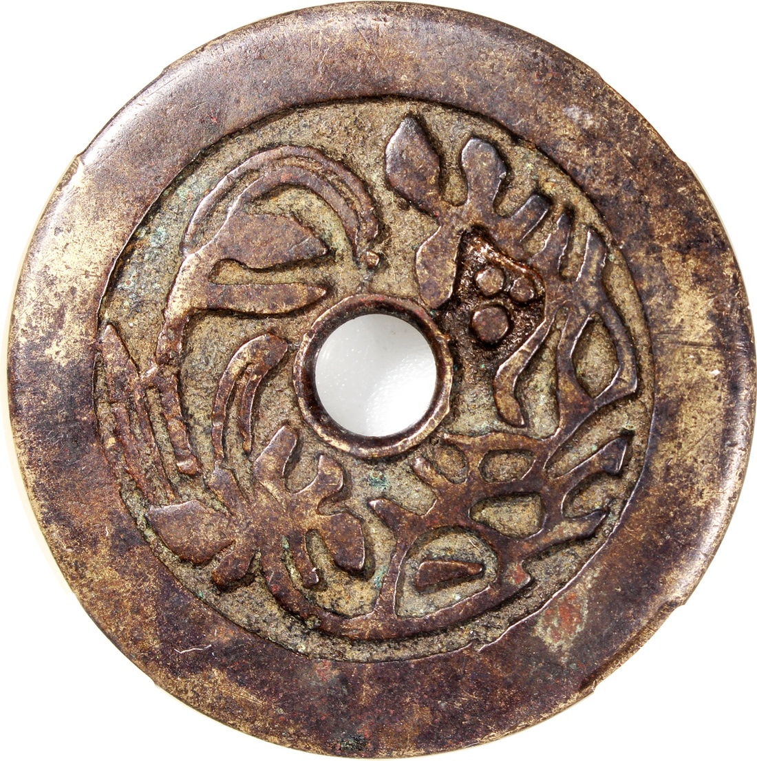 China: Qing Dynasty (1644-1911 CE), coin-shaped charm with round central hole, obverse inscribed 'Lian sheng gui zi', reverse showing lotus flowers and pods, 52.4*3.3mm, 47.6g, Zhong Qian 78. Extremely fine, extremely rare.