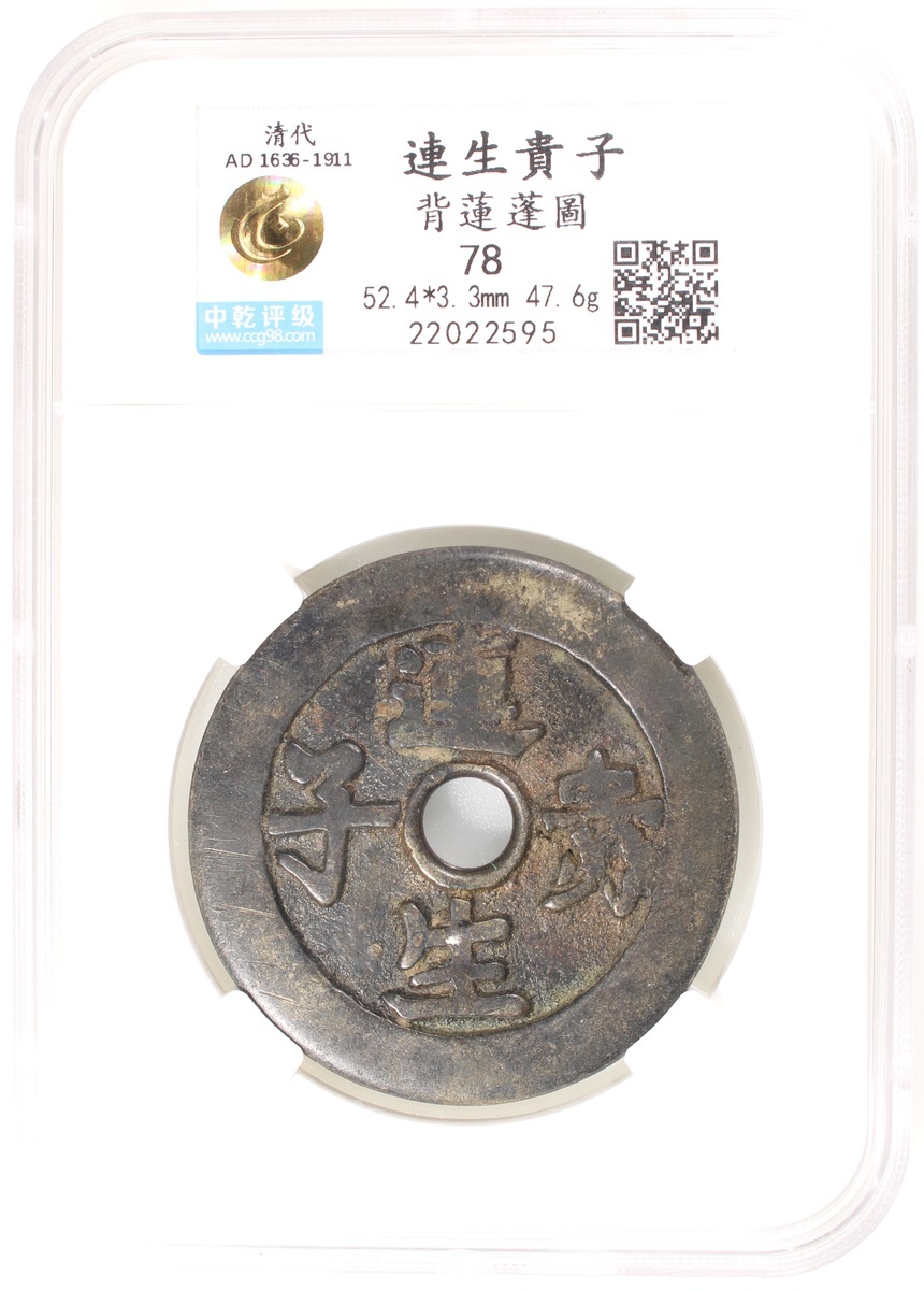 連生貴子圓孔花錢,背蓮花紋,清朝(公元1644–1911),52.4*3.3mm,重47.6g,中乾78。極美品。少見。