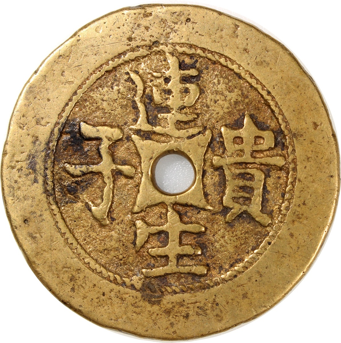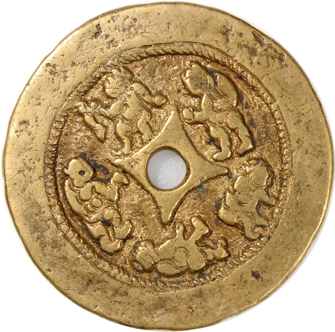 China: Qing Dynasty (1644-1911 CE), coin-shaped charm with round central hole, obverse inscribed 'Lian sheng gui zi', reverse showing five male children, 52.1*2.9mm, 42.3g. Extremely fine, rare.