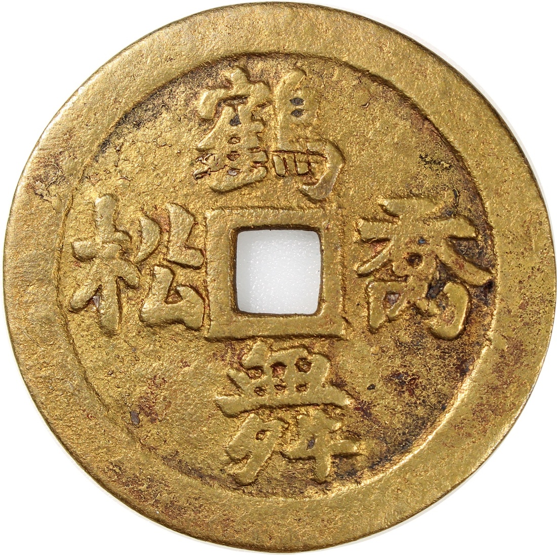 鶴舞喬松方穿花錢,背蓮花,清朝(公元1644–1911),49.7*1.9mm,重23.6g。品相極美,少見。