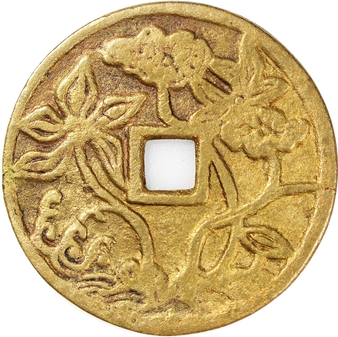 China: Qing Dynasty (1644-1911 CE), coin-shaped charm with square central hole, obverse inscribed 'He wu qiao song', reverse showing lotus flowers, 49.7*1.9mm, 23.6g. Extremely fine, rare.