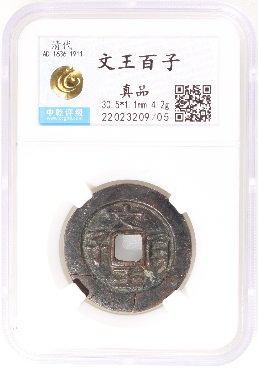 China: Song-Yuan Dynasty (960-1368 CE), coin-shaped charm with square central hole, obverse inscribed 'Wen wang bai zi', reverse plain, 30.5*1.1mm, 4.2g, Zhong Qian Genuine, labelled as Qing Dynasty. Extremely rare to see such a piece dating from the Song-Yuan period.