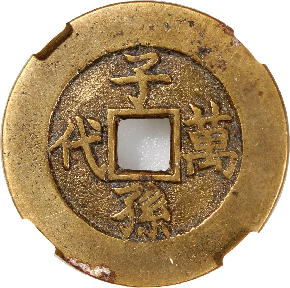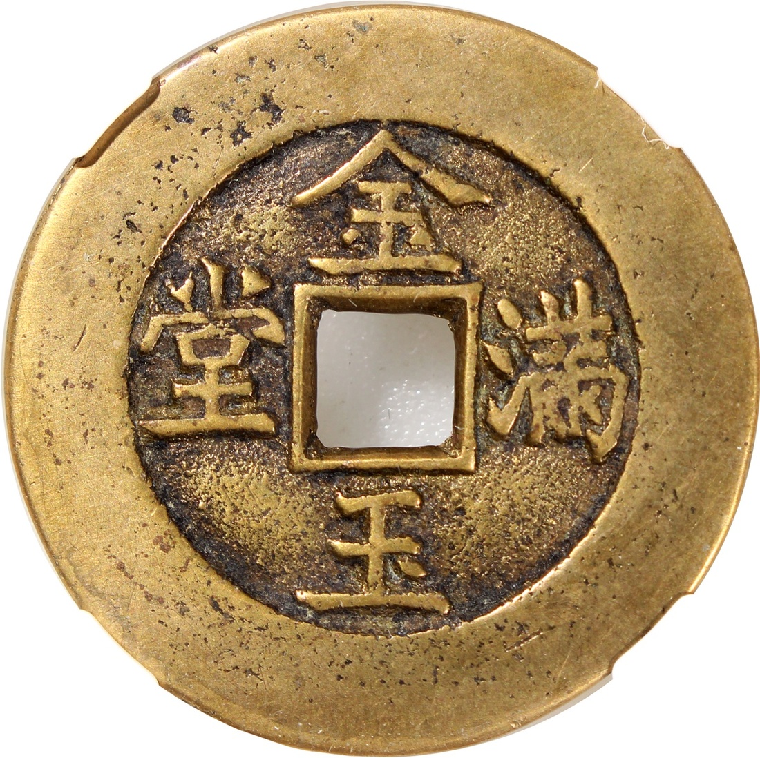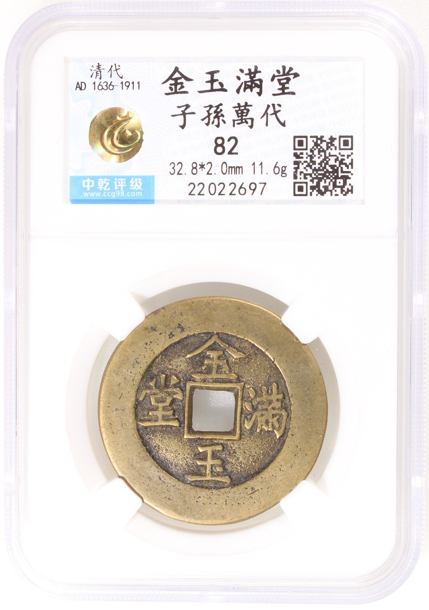 China: Qing Dynasty (1644-1911 CE), coin-shaped charm, Peking mint production, obverse inscribed 'Jin yu man tang' in regular script and reverse inscribed 'Zi sun wan dai' in regular script, 32.8x2.0mm, 11.6g, Zhong Qian 82. Extremely fine, very rare.