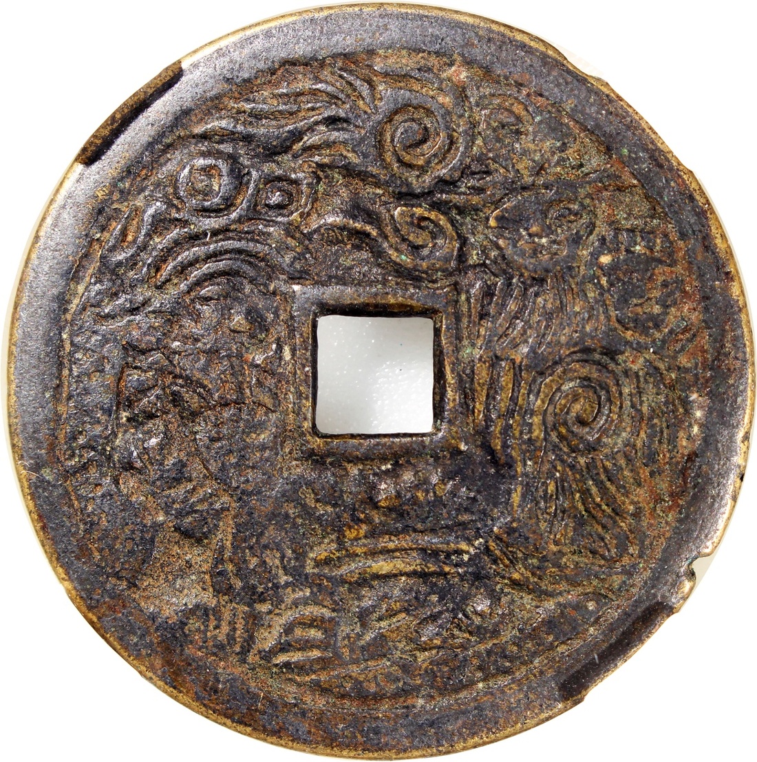雲爐指日高昇方穿花錢,背人物花卉,清朝(公元1644–1911),44.4*2.2mm,重21.3g,極美品,少見,中乾真品。