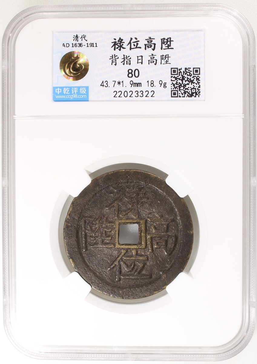 雲爐祿位高昇方穿花錢,背人物花卉,清朝(公元1644–1911),43.7*1.9mm,重18.9g,極美品,少見,中乾80。