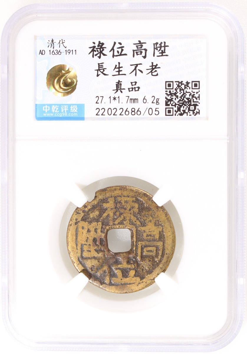 祿位高昇方穿花錢,背長生不老,清朝(公元1644–1911),27.1*1.7mm,重6.2g,中乾真品。少見。