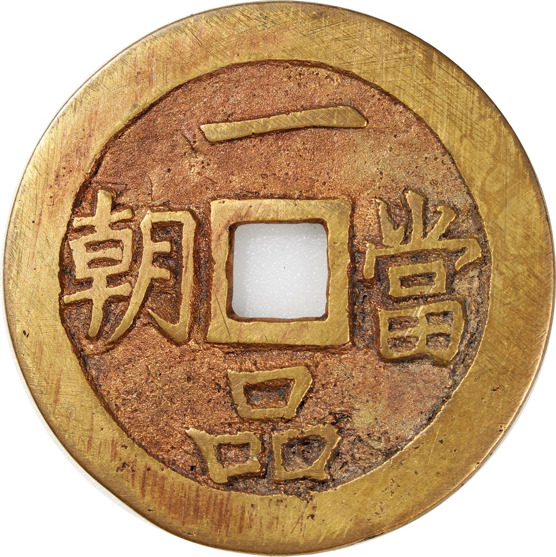 China: Qing Dynasty (1644-1911 CE coin-shaped charm with square central hole, obverse inscribed 'Yi pin dang chao', reverse inscribed 'Lian sheng san ji', 46.1*2.4mm, 26.5g. Rare.