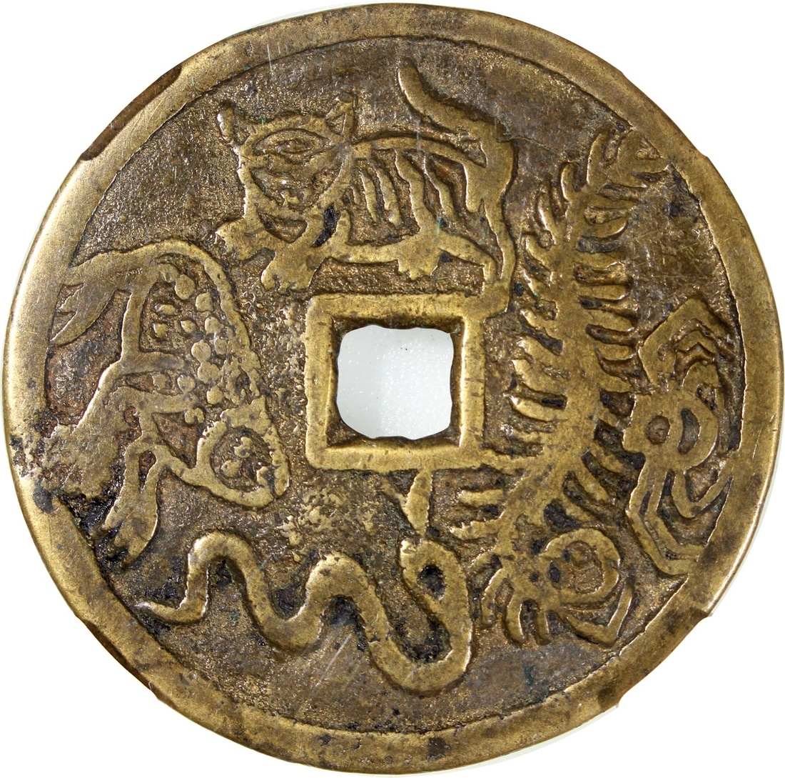 China: Qing Dynasty (1644-1911 CE), coin-shaped charm, Jiangxi mint production obverse inscribed 'Fu gui chang le' in seal script, reverse showing five poisonous animals, 48.3*1.8mm, 20.0g, Zhong Qian 82.