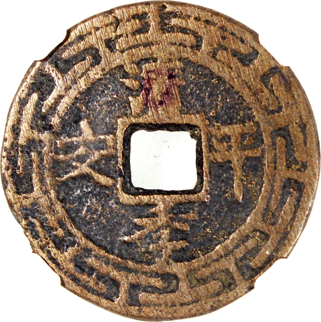 China: Qing Dynasty (1644-1911 CE), ), coin-shaped charm with square hole, obverse inscribed 'Qing ji ping an', reverse inscribed 'Fu gui chang jiu', 26.1*1.5mm, 5.5g, Zhong Qian Genuine.