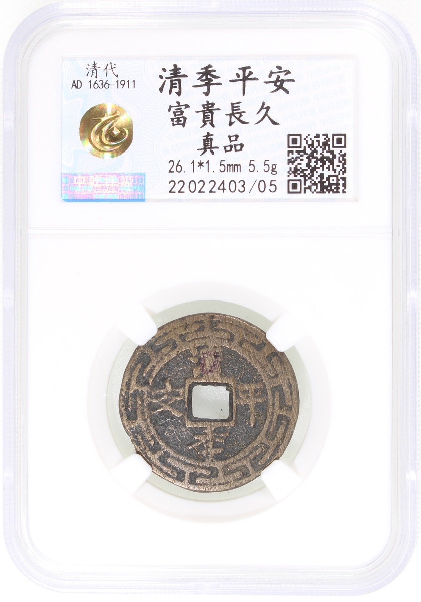 清季平安方穿花錢,背“富貴長久”,清朝(公元1644–1911),26.1*1.5mm,重5.5g,中乾真品。
