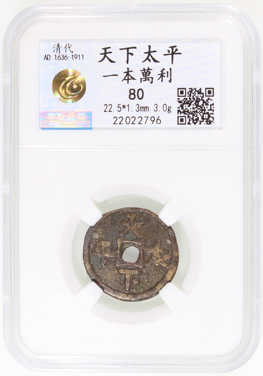 天下太平決穿花錢,背一本萬利,清朝(公元1644–1911),22.5*1.3mm,重3.0g,中乾80。好品。