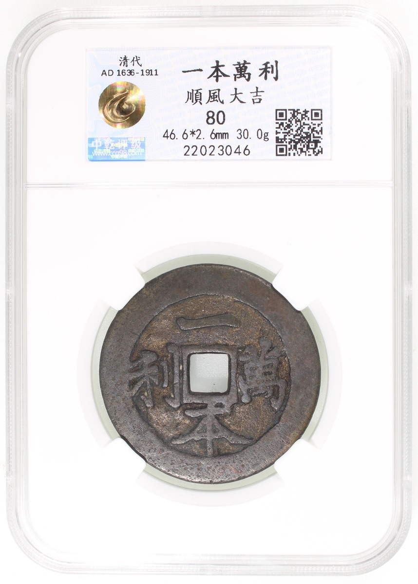 一本萬利方穿花錢,背順風大吉,清朝(公元1644–1911),46.6*2.6mm,重30.0g,中乾80。
