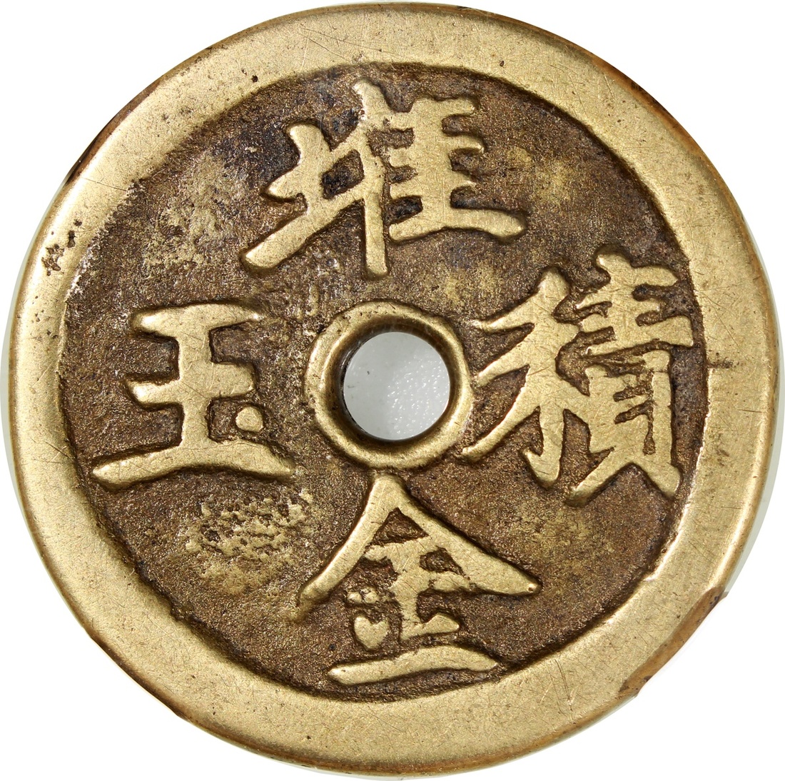 China: Qing Dynasty (1644-1911 CE), coin-shaped charm with round central hole, obverse inscribed with 'Yi ben wan li', reverse inscribed 'Dui jin ji yu', 43.3*3.3mm, 30.4g, Zhong Qian 82. Extremely fine, very rare.