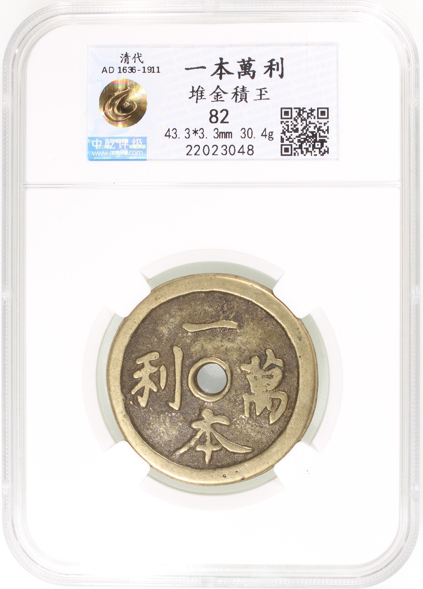 一本萬利圓穿花錢,背堆金積玉,清朝(公元1644–1911),43.3*3.3mm,重30.4g,中乾82。品相極美,罕見。