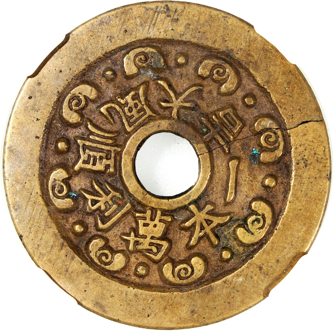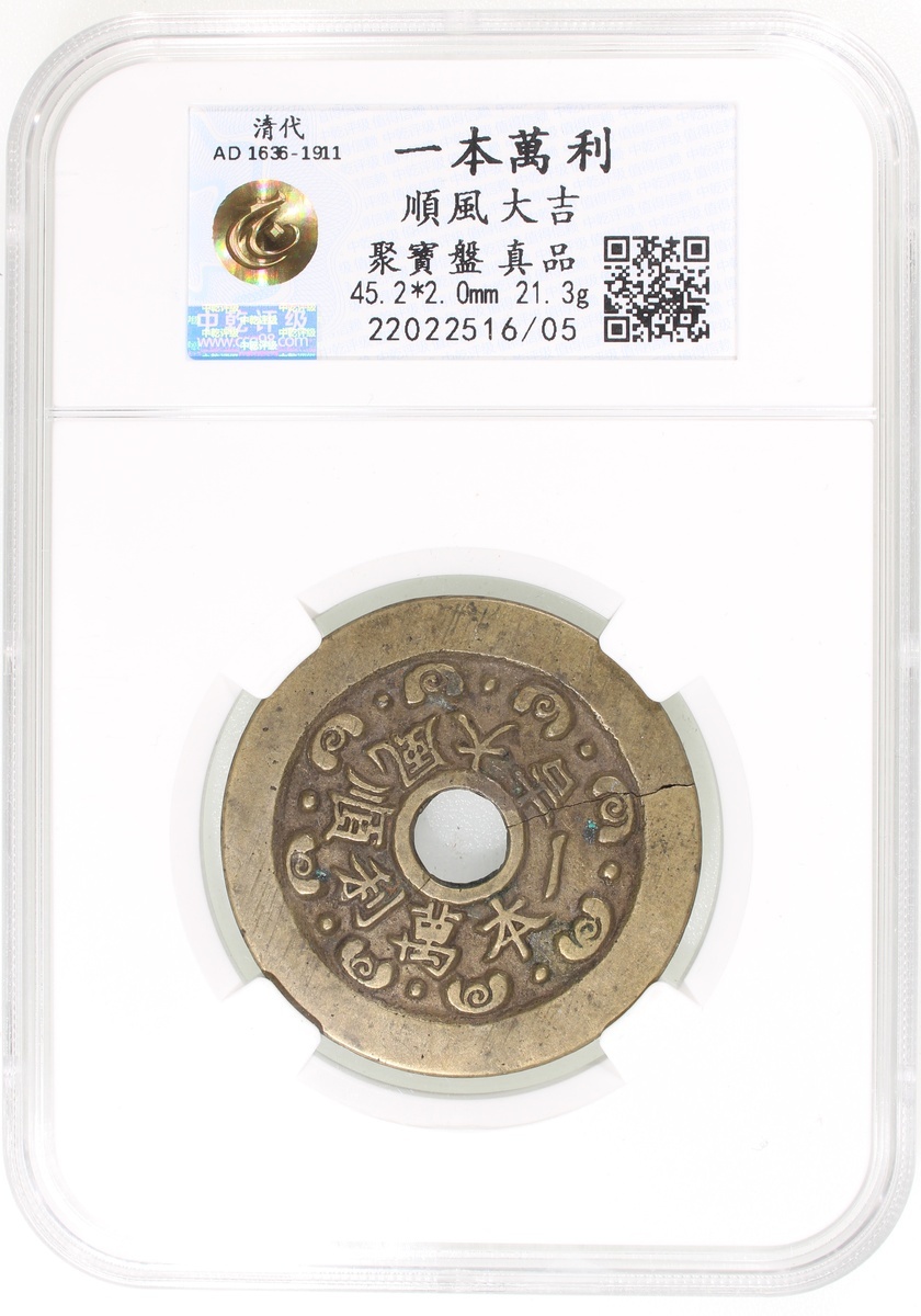 一本萬利順風大吉圓孔花錢,背胡人獻寶,清朝(公元1644–1911),45.2*2.0mm,重21.3g,中乾真品。