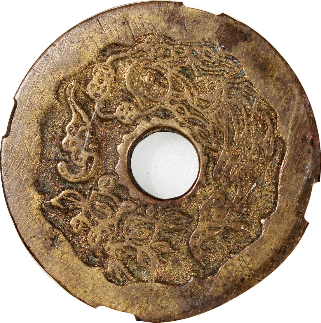 China: Qing Dynasty (1644-1911 CE), coin-shaped charm with round central hole, obverse inscribed 'Yi ben wan li zhao cai jin bao', reverse showing boy with treasures, 41*2.0mm, 18.0g, Zhong Qian 78. Extremely fine, extremely rare.