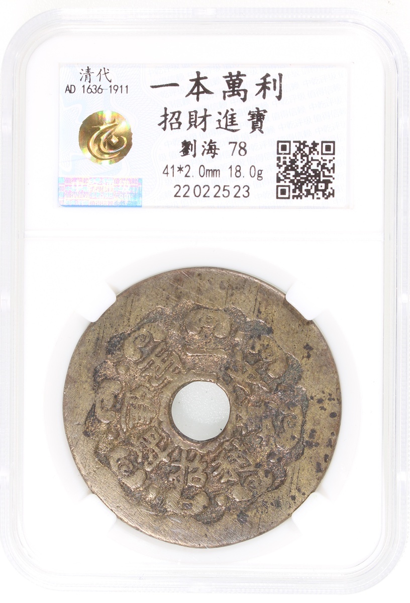 蘇爐一本萬利招財進寶圓孔花錢,背童子送寶,清朝(公元1644–1911),41*2.0mm,重18.0g,中乾78。極美品。少見。