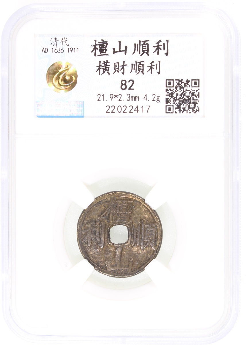 粵爐檀山順利方穿花錢,背“橫財順利”,清朝(公元1644–1911),21.9*2.3mm,重4.2g,中乾82。錢文罕見。罕見。
