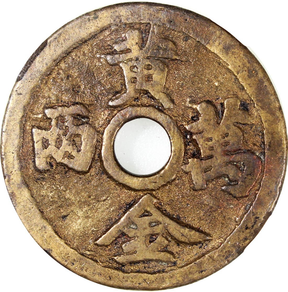 China: Qing Dynasty (1644-1911 CE), coin-shaped charm with round central hole, obverse inscribed 'Zhao cai jin bao', reverse inscribed 'Huang jin wan liang', 45.9*2.6mm, 25.4g, Zhong Qian 82. Rare.