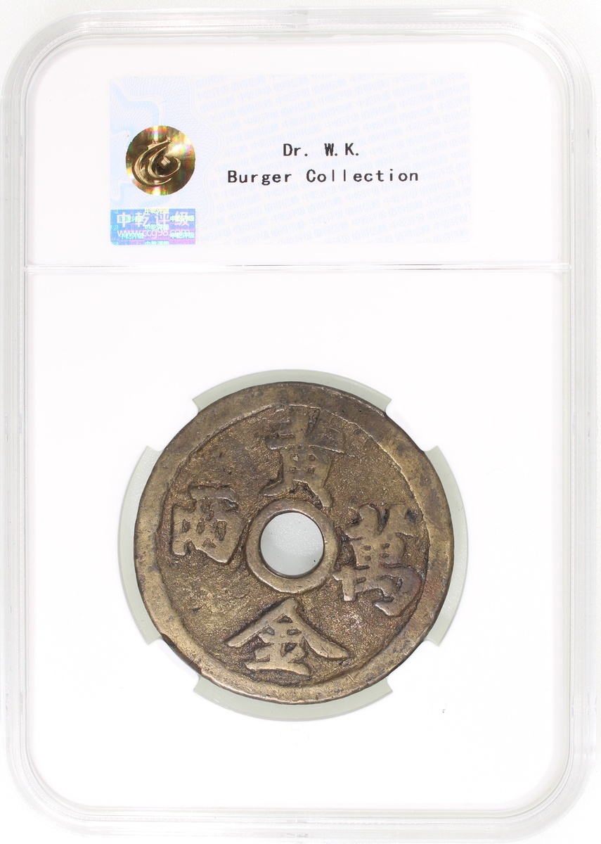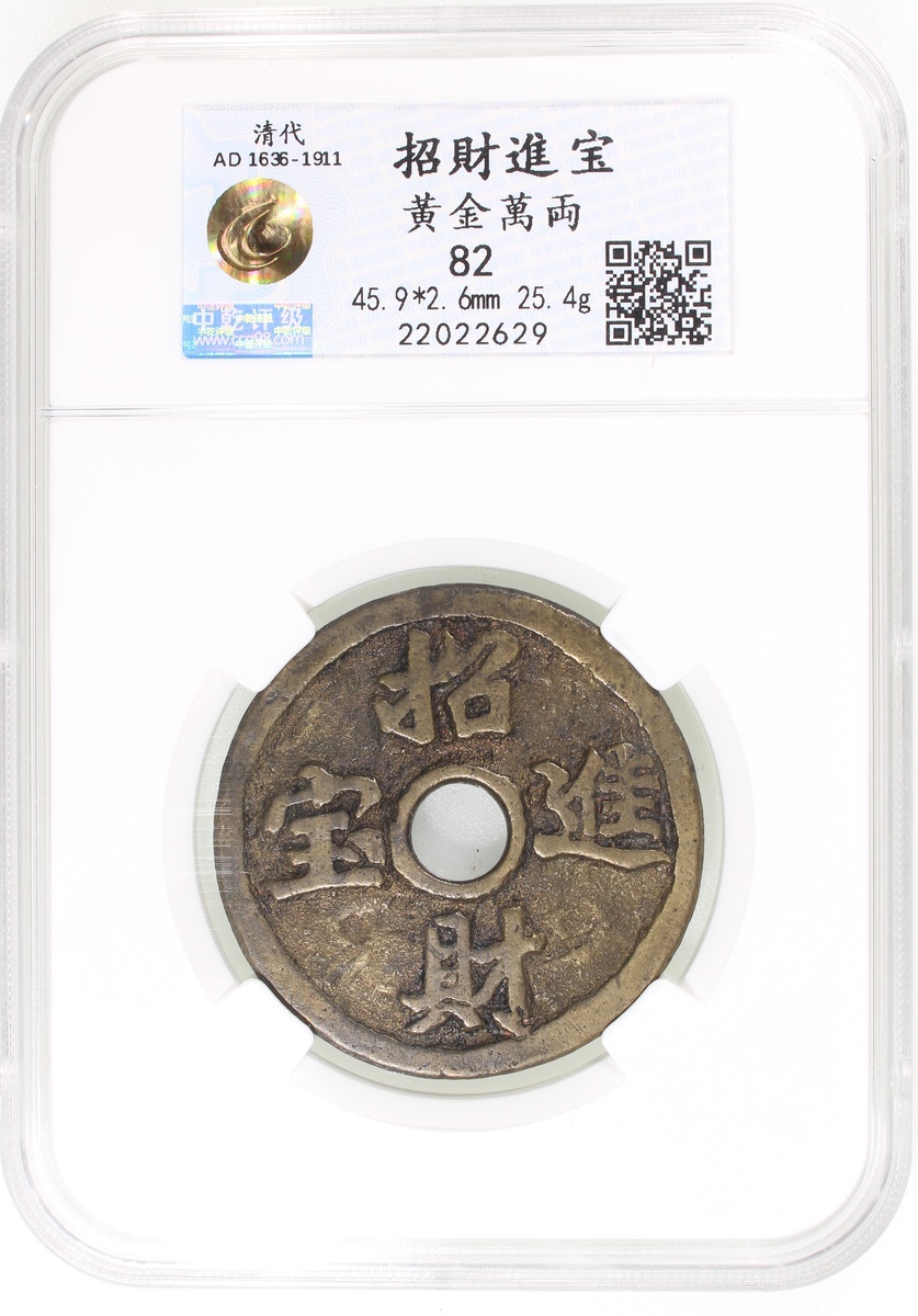 招財進寶圓孔花錢,背黄金萬両,清朝(公元1644–1911),45.9*2.6mm,重25.4g,中乾82。少見。
