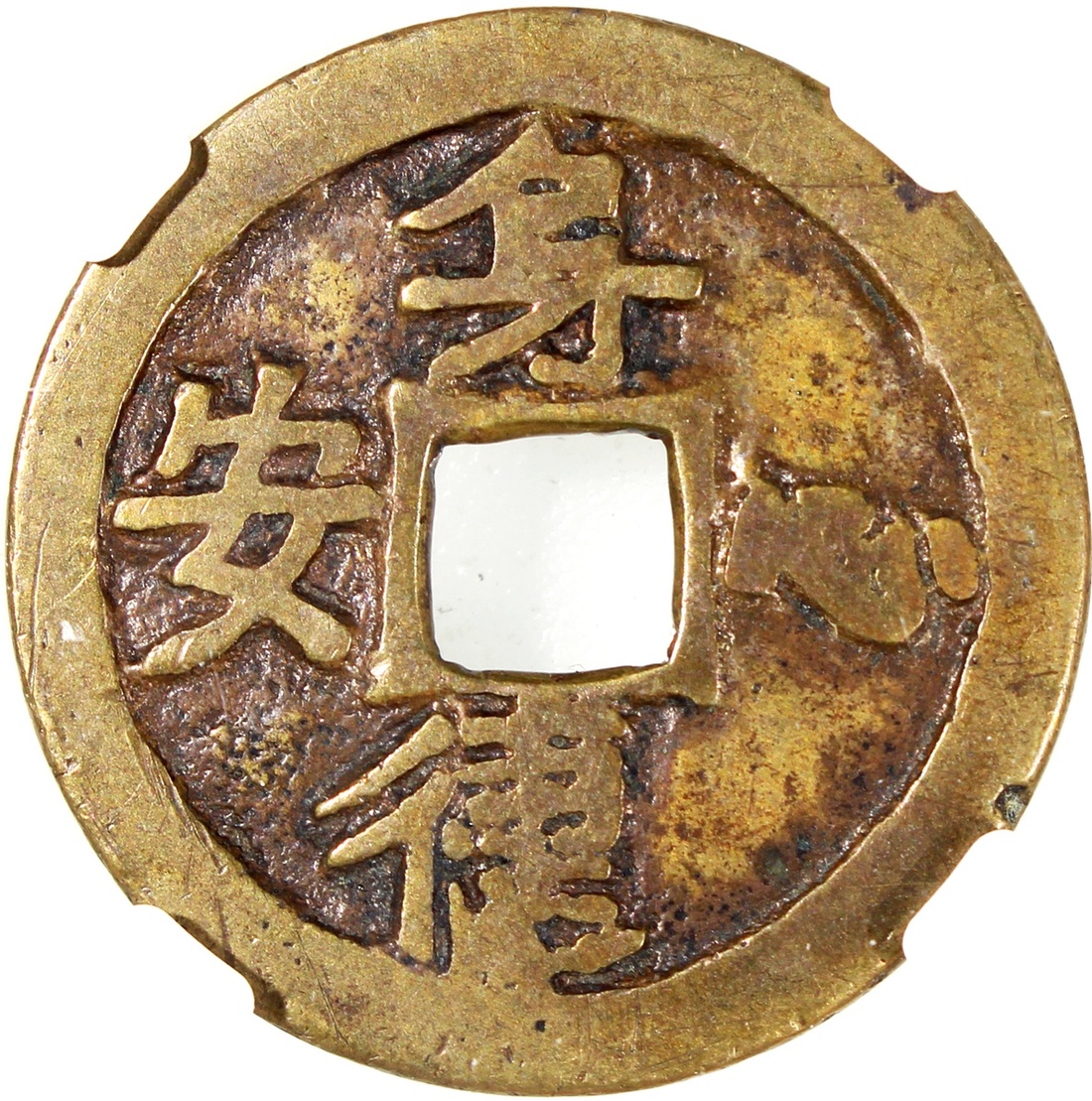 China: Qing Dynasty (1644-1911 CE), coin-shaped charm with square central hole, obverse inscribed 'Jia he cai sheng', reverse inscribed 'Sheng jian xin an', 28.1*1.5mm, 6.2g, Zhong Qian 78. Rare inscriptions.