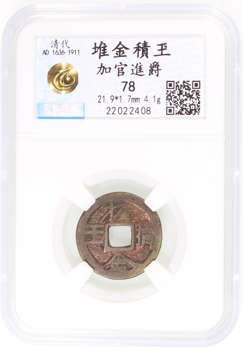 堆金積玉方穿花錢,背“加官進爵”,清朝(公元1644–1911),21.9*1.7mm,重4.1g,中乾78。