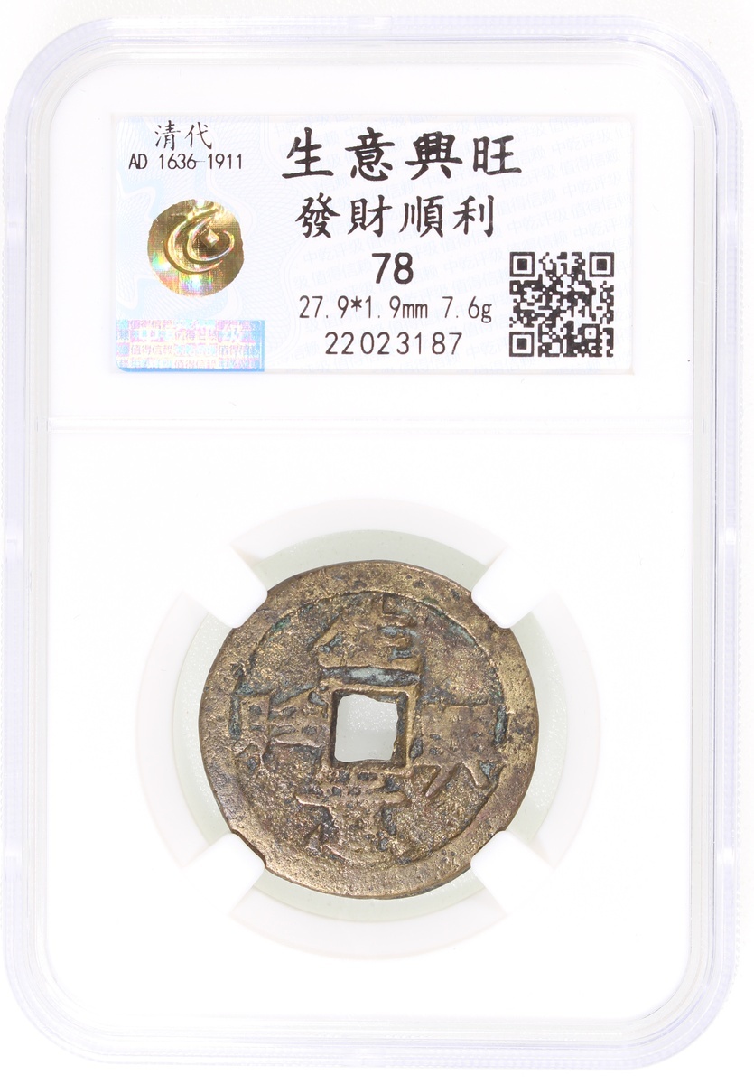 China: Qing Dynasty (1644-1911 CE), coin-shaped charm with square central hole, obverse inscribed 'Sheng yi xing wang', reverse inscribed 'Fa cai shun li', 27.9*1.9mm, 7.6g. Zhong Qian 78. Rare.